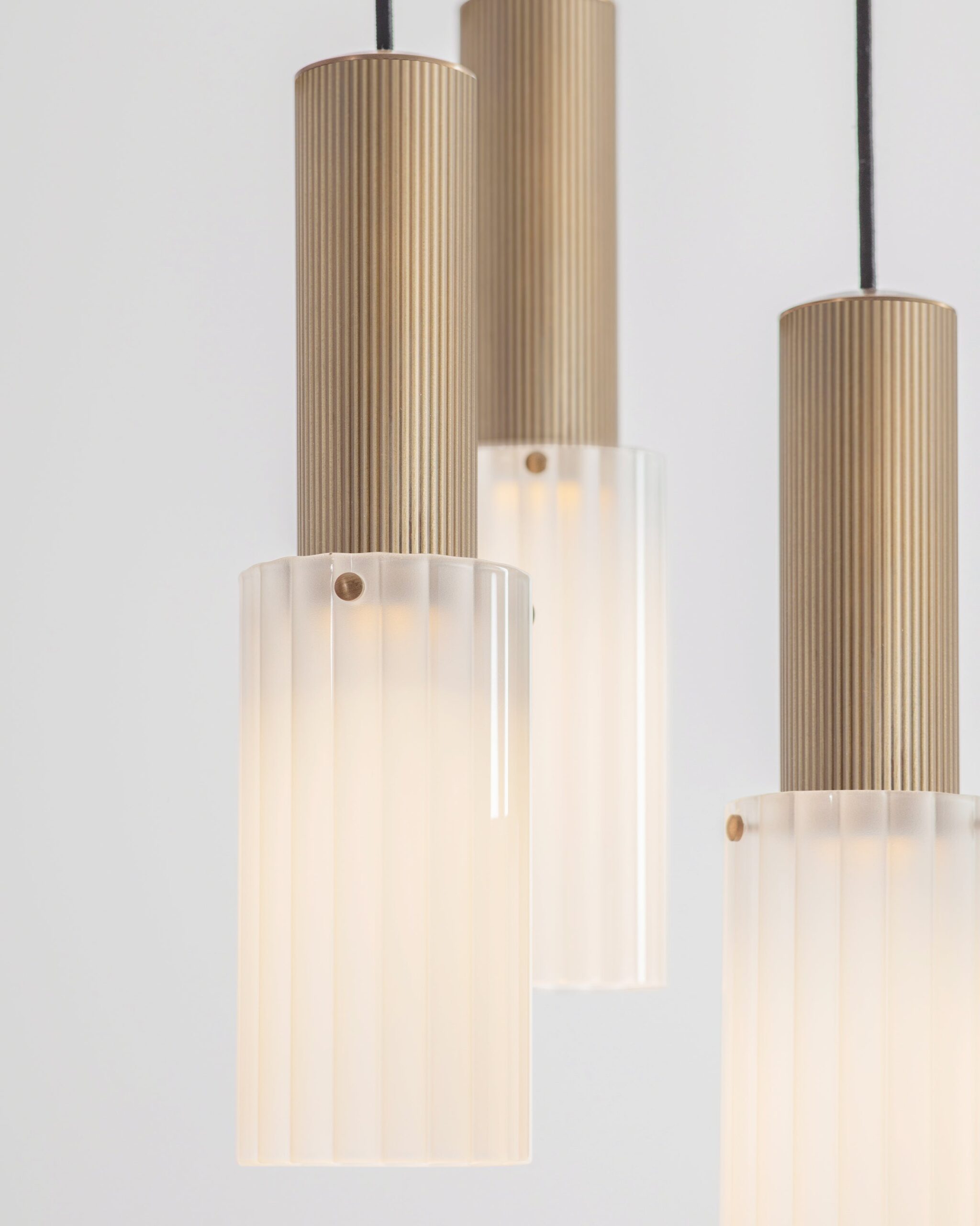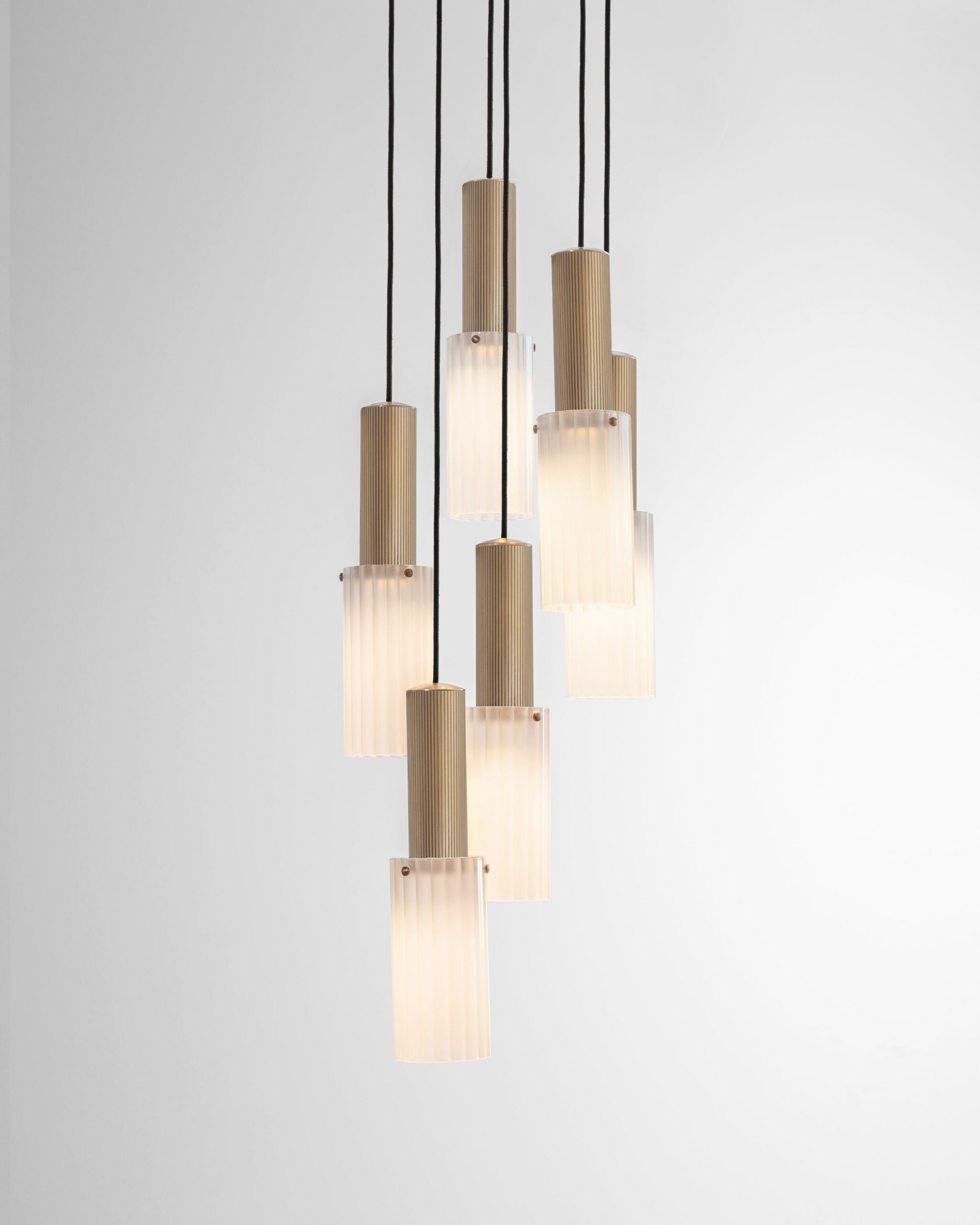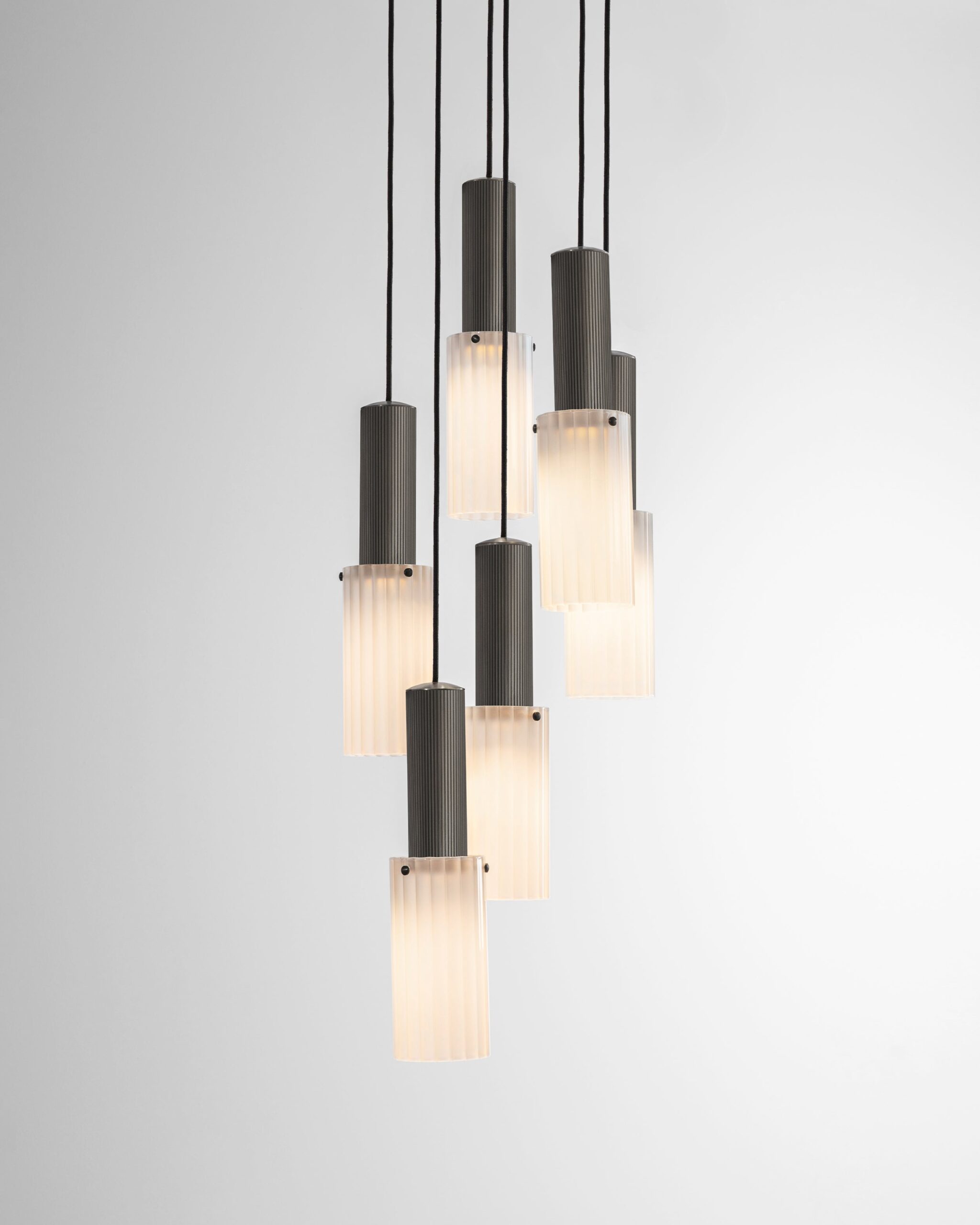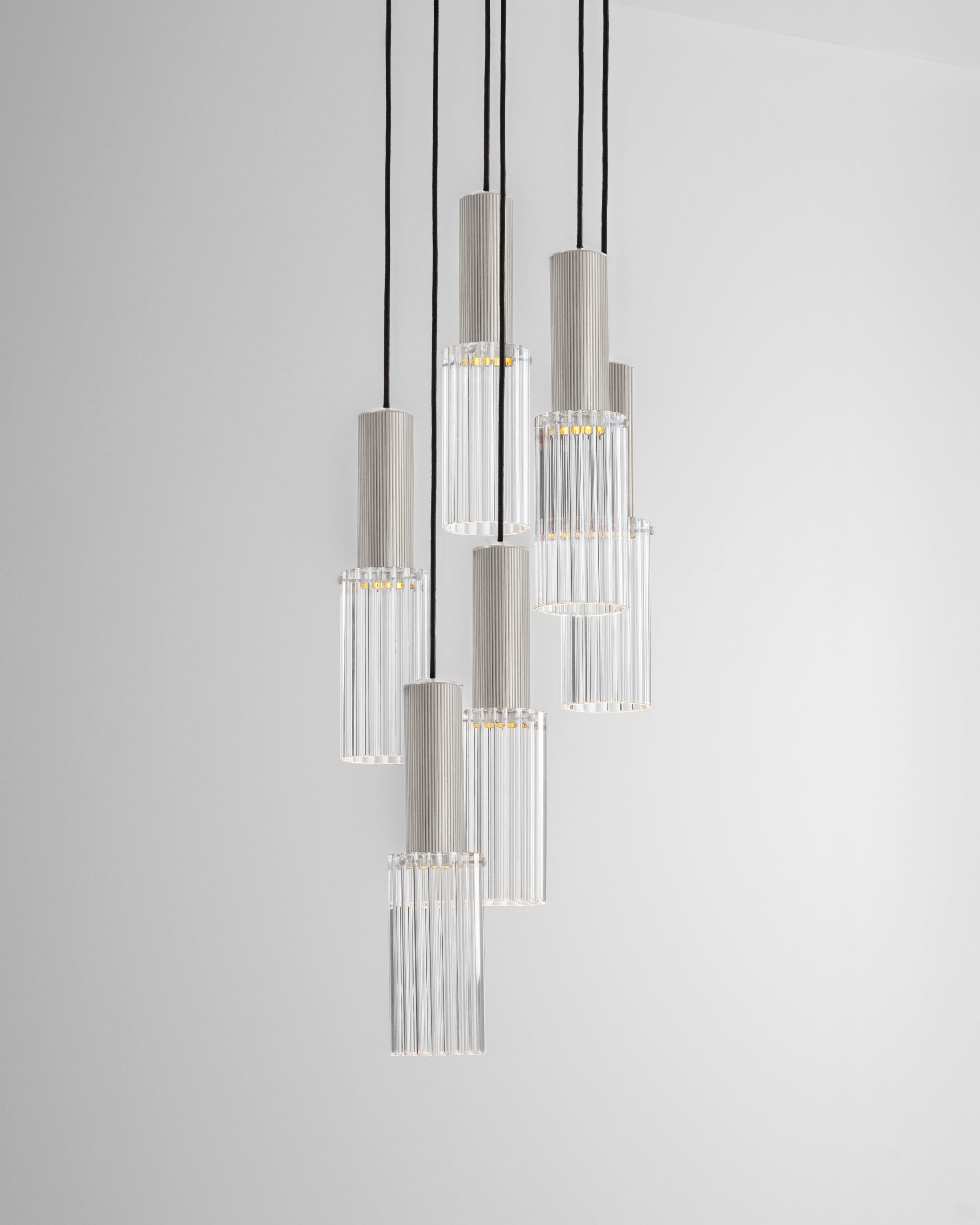 A dynamic six-drop arrangement of the Flume 80 Pendant, where contemporary design and precision engineering converge to create a truly unique lighting installation.