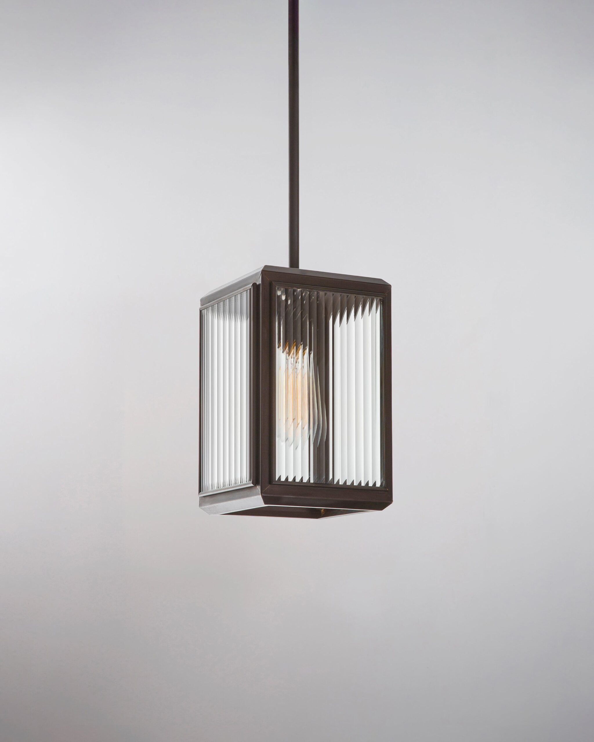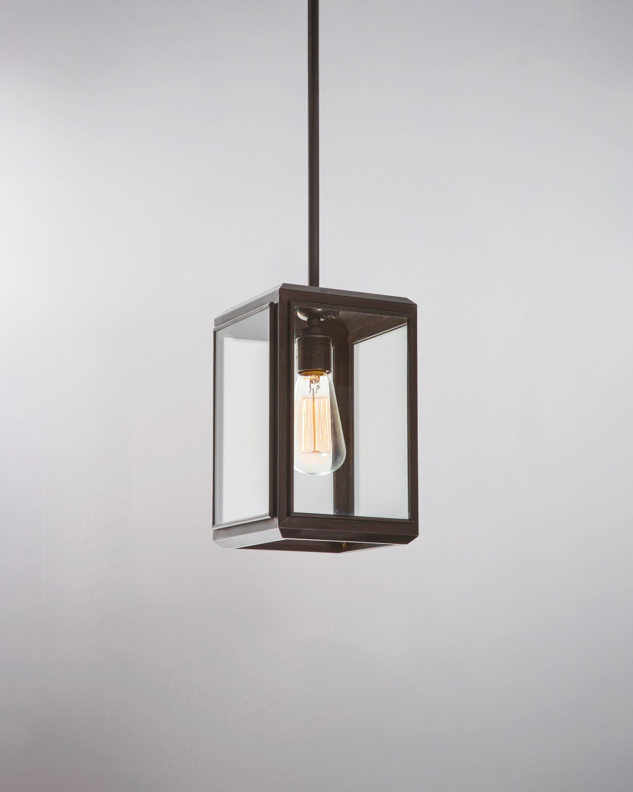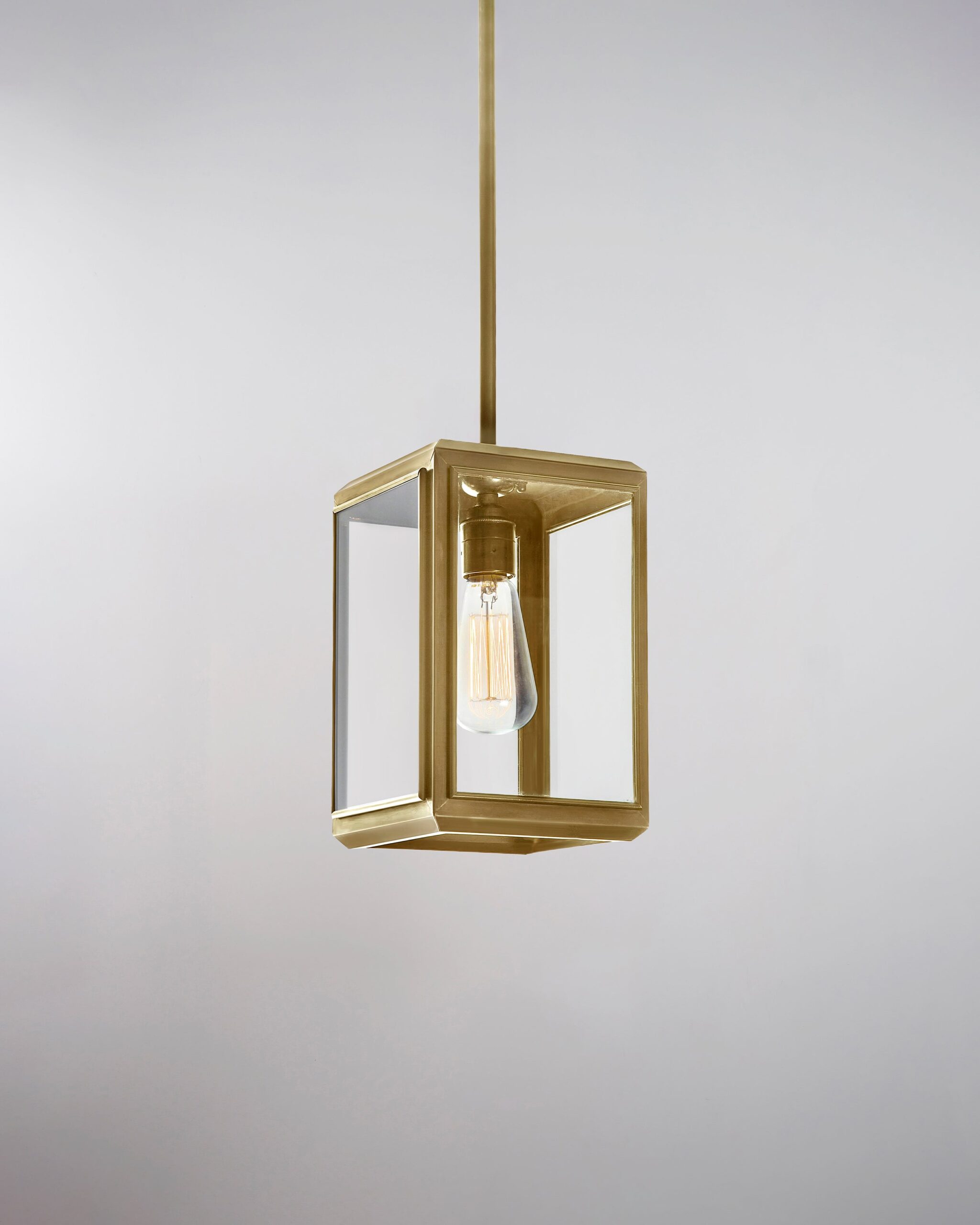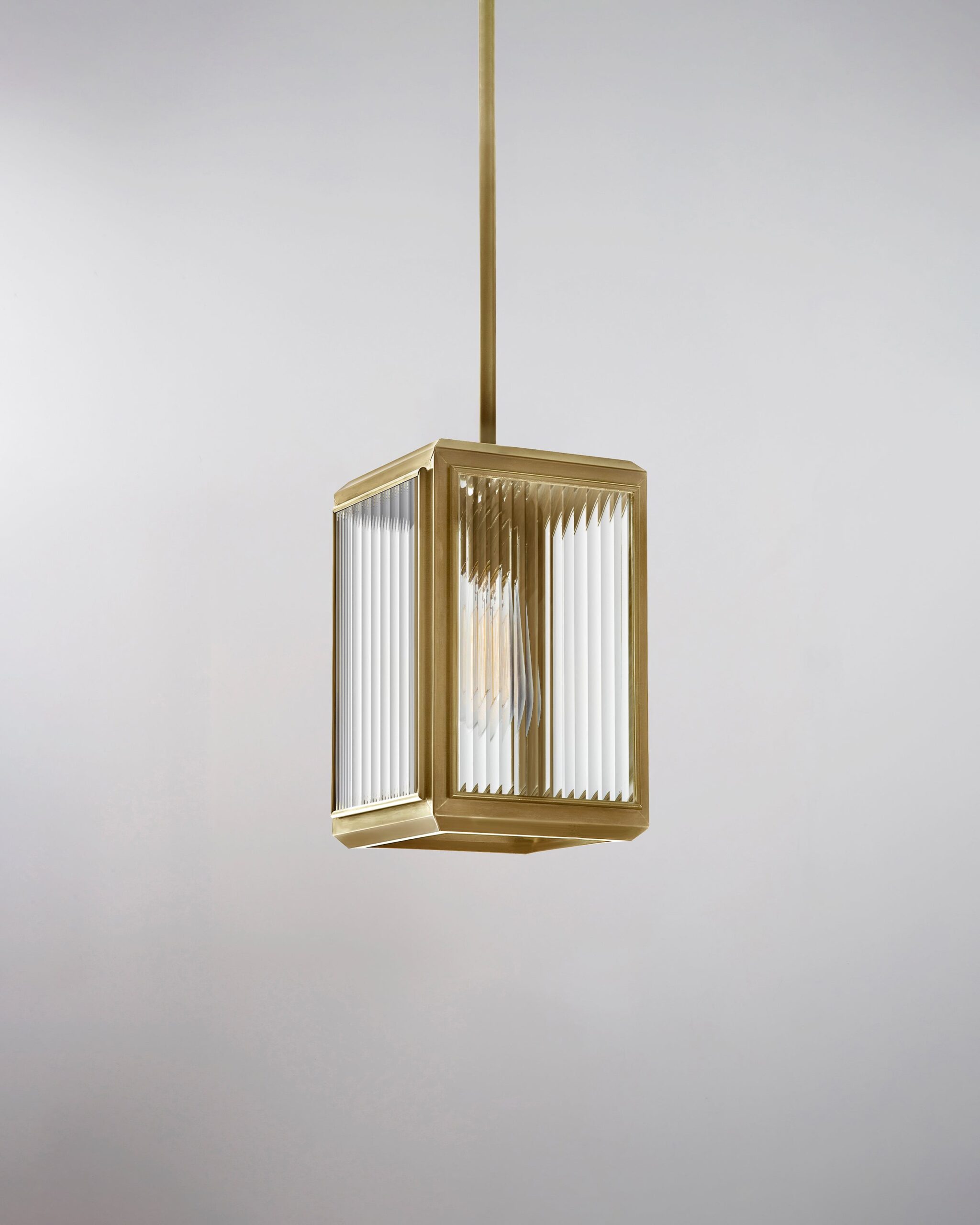 The Lilac Small Pendant features a classic lantern design, crafted in bronze or antique brass, with the option of clear or reeded glass for a subtly diffused glow.