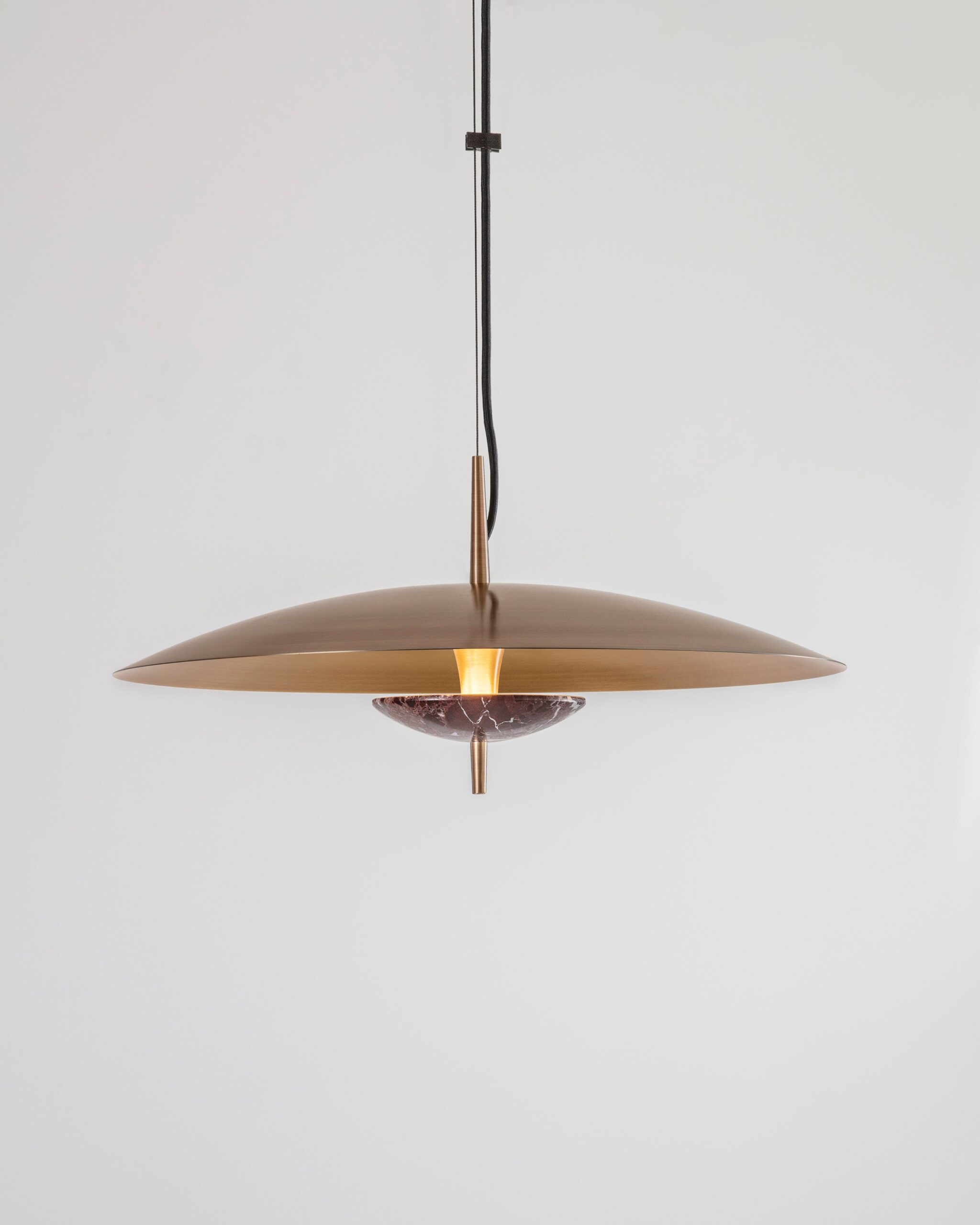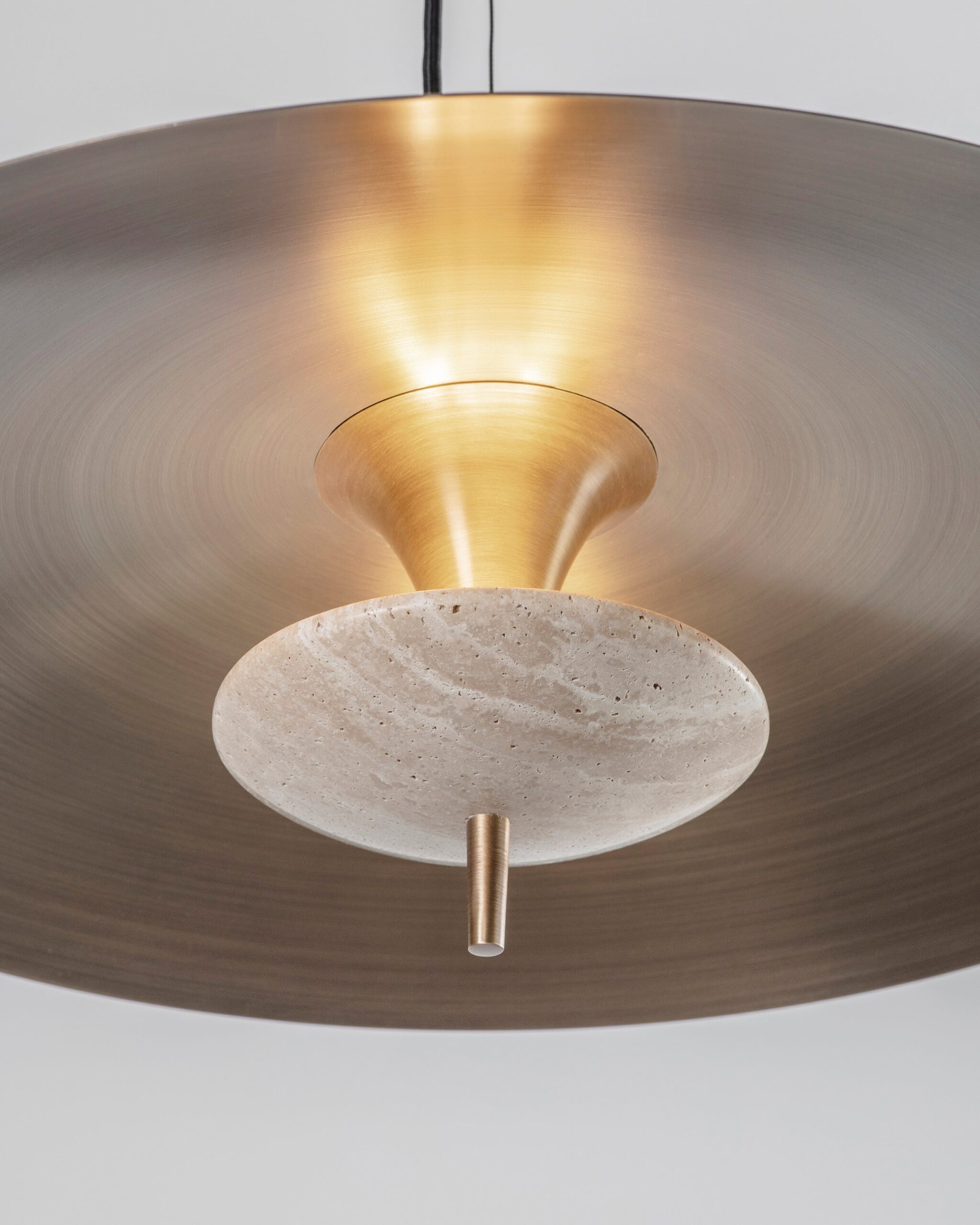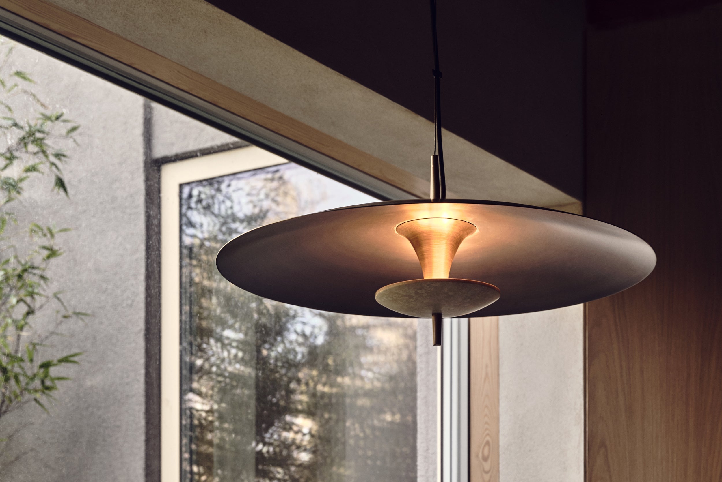 Inspired by the cosmos and the effect of a total eclipse, the Luna 550 Pendant features a 550mm hand-spun dish that reflects light, casting a warm, outward halo of illumination.