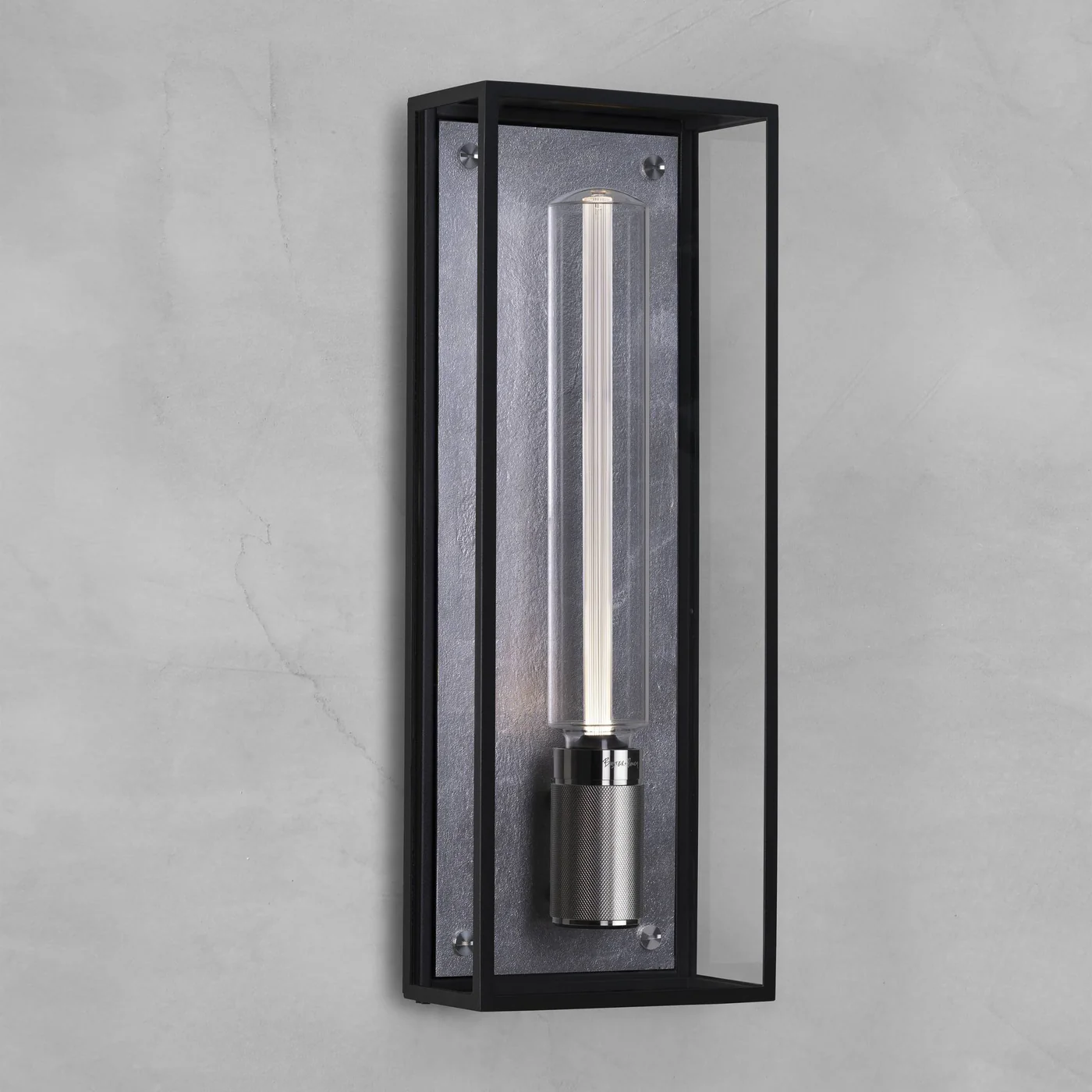• Matt black metal and glass cage with cast metal back panel